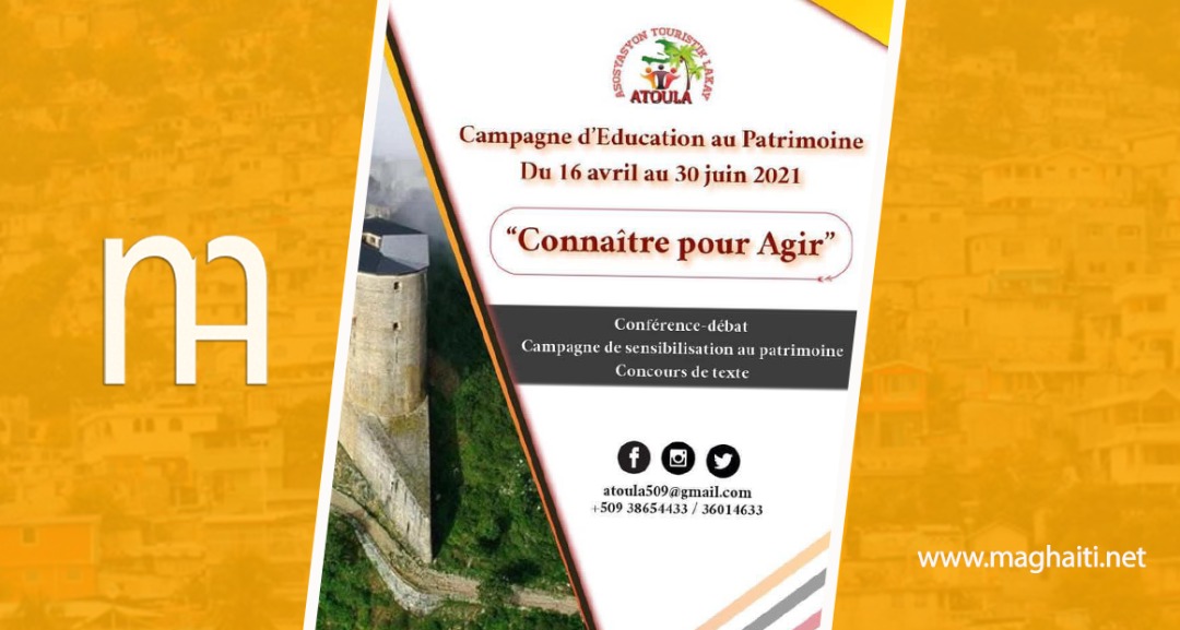 Asosyasyon Touristik Lakay (ATOULA) veut prendre sa part de responsabilité avec brio dans l’éducation culturelle Haïtienne. Cette association lance une campagne d’éducation au patrimoine du 16 avril au 30 juin 2021, sous le thème “Connaître pour agir”.