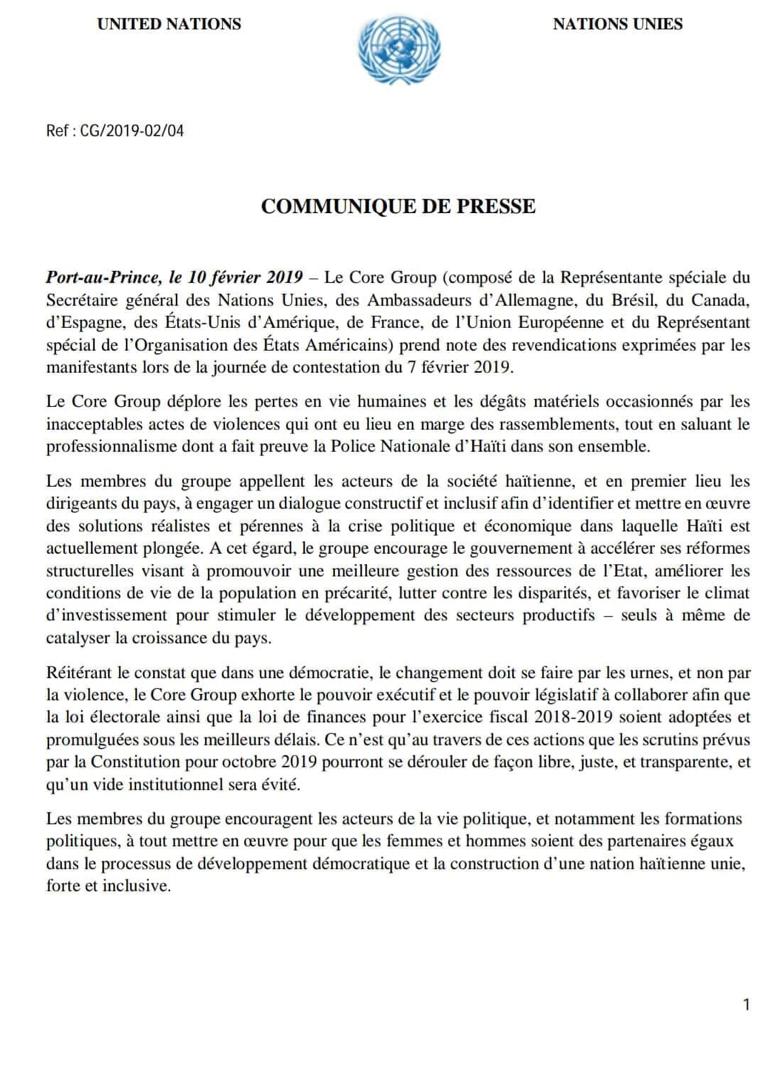 Dans un communiqué , Core groupe appelle les acteurs de la société haïtienne ainsi que les dirigeants du pays au dialogue. Core groupe qui est une organisation internationale composée entre autres, de la représentante spéciale du secrétaire générale des Nations-Unies, des ambassadeurs d’Allemagne,du Brésil ,du Canada,d’Espagne ,des États unis d’Amérique pour ne citer que cela.
