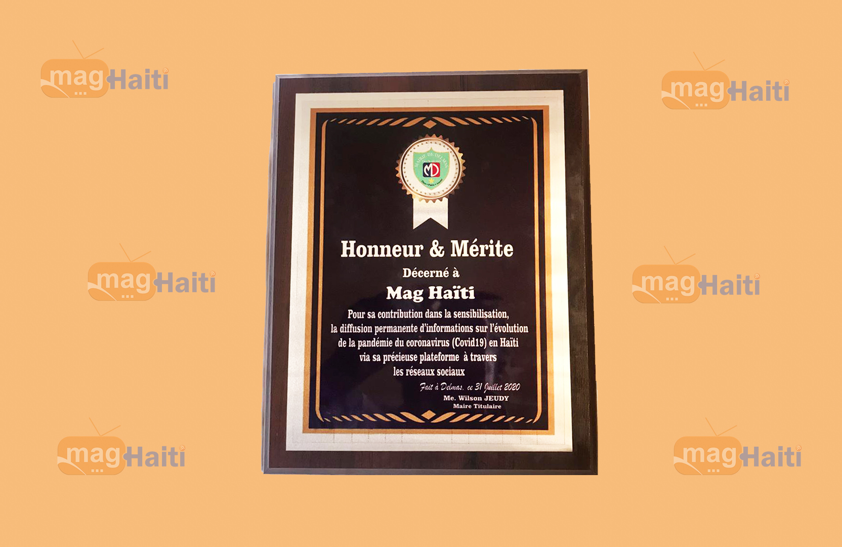 “Pour sa contribution dans la sensibilisation, la diffusion permanente d’informations sur l’évolution de la pandémie du Coronavirus en Haïti via sa précieuse plateforme à travers les réseaux sociaux“, lit-t-on dans cette plaque signée du Maire, Wilson Jeudy.