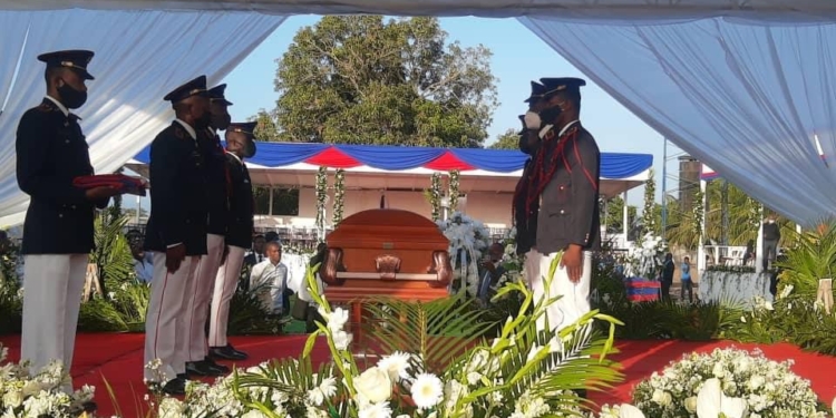 C’est dans un minibus que le cercueil de l’ancien président a été transporté sur le lieu où son corps sans vie a été inhumé. Une stratégie pour dévier l’attention des riverains capois qui occupent les rues de la 2e ville du pays depuis 48 heures. En présence de l’ex première dame Martine et ses enfants, Jovenel Moïse Junior, Joverlin, Jomarlie Moïse, plusieurs partisans scandaient des slogans hostiles a certains hauts dignitaires de l’ancien gouvernement de facto, tout en réclamant justice pour le défunt lâchement assassiné.