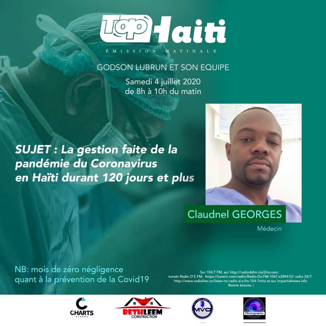 Claudnel Georges, Médecin et responsable du centre de santé de la localité de Bocbanique dans la commune de Thomassique dans le département du Centre a réagi à l’émission Top Haïti le samedi 4 juillet 2020 autour de la reprise des activités lancée partiellement par le gouvernement haïtien. Ce show radiophonique, rappelons-le, est diffusé en duplex tous les samedis matins entre 8h et 10h sur la radio Top Haïti hébergée sur la plateforme zeno et sur les ondes du 104.7 FM et sur tunein radio D’S.