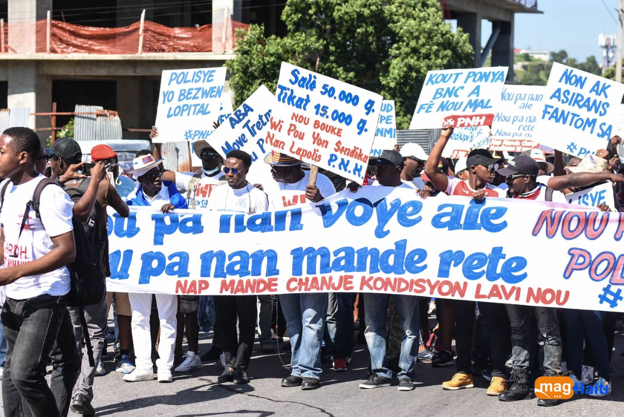 « Non à l’assurance-fantôme. Un salaire de base de 50 milles gourdes et une carte de débit de 15 milles gourdes », figurent sur les pancartes brandies par les policiers dans la marche.