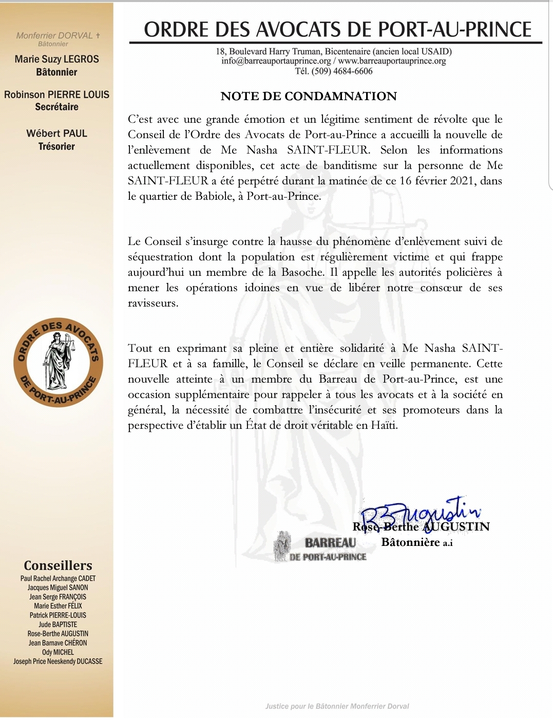 Dans une note rendue publique ce mardi 16 février 2021, le conseil de l’Ordre des Avocats de Port-au-Prince condamne l’enlèvement suivi de séquestration de Me. Nasha Saint-Fleur, membre du barreau de la capitale. Le conseil demande par conséquent, aux autorités de se débrouiller afin de libérer l’avocate de ses ravisseurs.