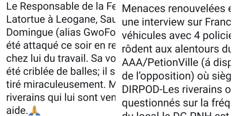48 heures après les menaces de Jovenel Moïse proférées à l’endroit de l’ex Sénateur Youri Latortue, le resppnsable de la ferme Latortue à Léogane, Saurel Domingue, a failli laisser sa peau dans une fusillade où sa voiture a été criblée de balles. Dieu merci, il s’en est sorti indem.