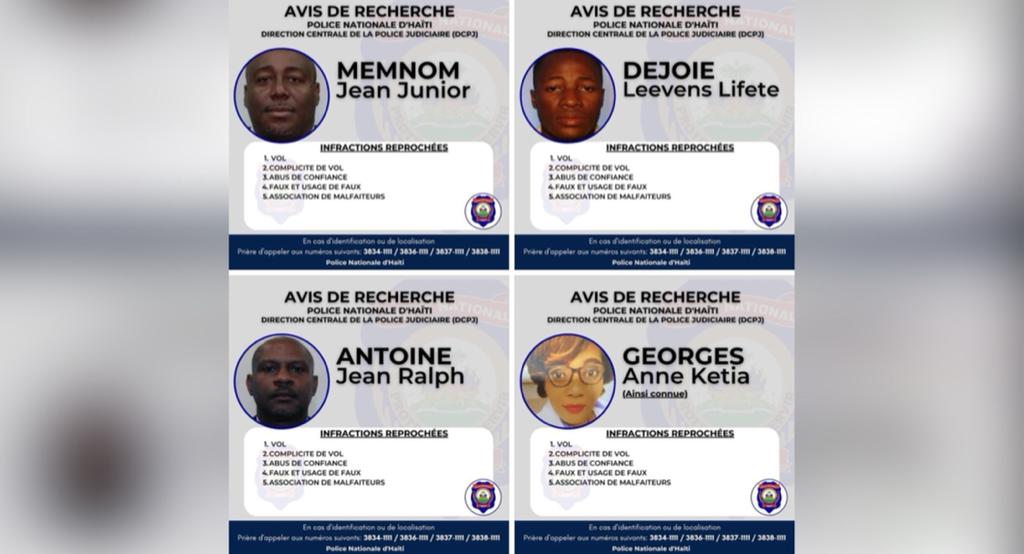 “4 anplwaye Sogebank sa yo Biwo finansyè ak Ekonomik ki se yon pati nan Direksyon Santral Polis Jidisyè (DCPJ) ap chache yo“, se sa responsab enstitisyon polisyè a fè konnen pandan yo envite tout popilasyon ayisyen an pou kolabore ak yo pou rive mete men sou sitwayen sa yo.