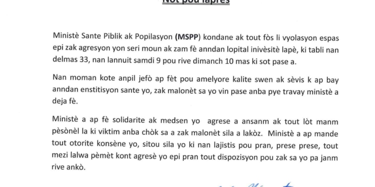 Le Ministère de la Santé Publique et de la Population (MSPP) condamne avec véhémence les actes d’agressions qui ont été perpétrées par des individus armés au sein de l’hôpital universitaire La Paix dans la nuit du 9 au 10 mars 2019.
