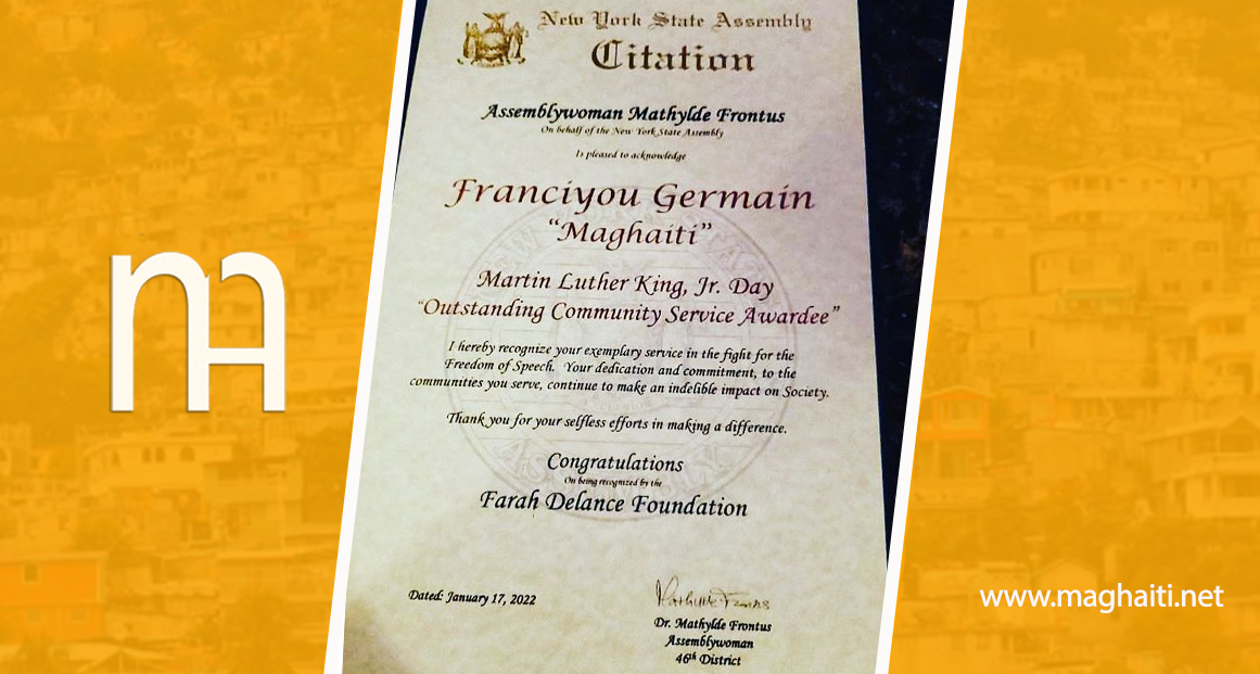 Ce lundi 17 janvier 2022, le Groupe Média MAGHAITI a été distingué par la Farah Délance Fondation au fameux prix “Freedom of speech” à l’occasion de Martin Luther King Jr day pour son travail en faveur de la communauté haïtienne.
