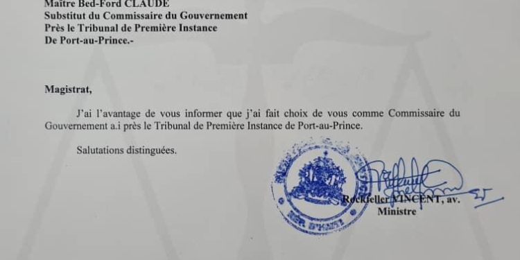 A quelques heures de la fin du mandat constitutionnel de Jovenel Moïse, le Ministre de la Justice Me. Rockfeller VINCENT nomme un nouveau Commissaire a.i du gouvernement à la tête du parquet de Port-au-Prince.