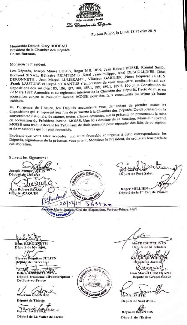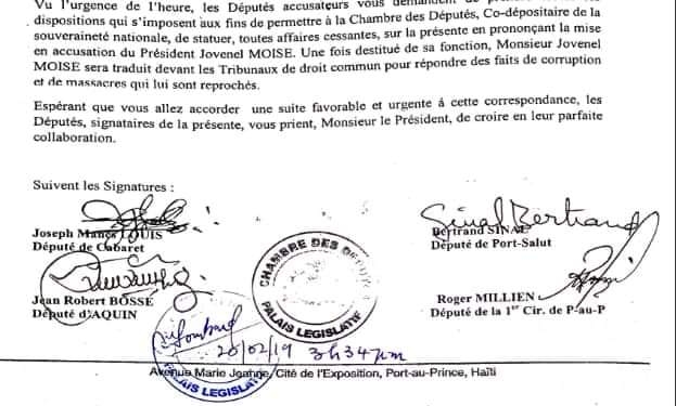 Comme signataires de cet acte proposant la mise en accusation du Président Jovenel Moïse, les honorables Députés de Cabaret (Joseph Manes Louis), de la Première Circonscription de Port au Prince (Roger Milien), de Port Salut (Sinal Bertrand), d’Aquin (Jean Robert Bossé), de Marigot (Déus Déroneth), de Mirebalais (Abel Descolines), de la 3e Circonscription de Port-au-Prince (Bélizaire Printemps), de Jacmel (Kétel Jean Philippe), de Grand Goâve (Jean Marcel Lumérant), de Thiotte (Vikerson Garnier), de la Vallée de Jacmel (Franck Lauture), de Saut d’Eau (Ronald Smith) et de l’Estère (Reynald Exantus).