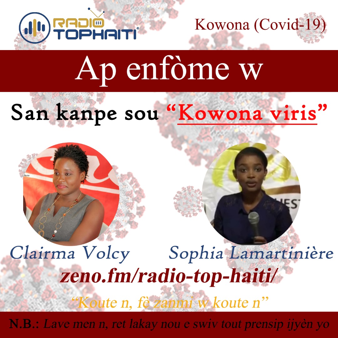 Sophia Lamartinière qui est actuellement en formation en Animation et Présentation Radio à un Centre de Communication et de Formation de Journalistes de la capitale. La jeune carrefourroise de 23 ans fait ses armes dans le domaine à travers le bulletin numéro un de la Radio TOP HAITI sur Zeno Radio et sur les Réseaux Sociaux de TOP HAITI et aussi par Clairma VOLCY également présentatrice des éditions Spéciales de nouvelles sur le Coronavirus sur la Radio TOP HAITI sur Zeno Radio et sur les Réseaux Sociaux de TOP HAITI et qui en plus de sa séquence de nouvelles, interagira avec un expert tous les soirs 18h sur la Radio TOP HAITI à la rubrique “l’invité”.