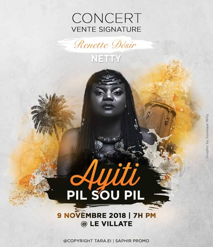 Ayiti Pil Sou Pil , tel est le titre du nouvel album de l’artiste Renette Désir, qui sera en vente de signature ce 9 Novembre 2018 à Le Villatte à compter de 7h PM. Un album contenant 10 morceaux regroupant les voix de plusieurs artistes tels que Princess Eud, Jean-Bernard Thomas, T-sax, Beby Joe pour ne citer que ceux-là.