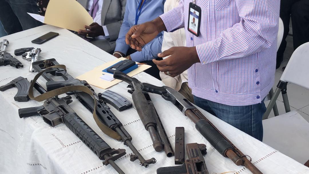 Port-au-Prince, le 28 mai 2019._ La Commission Nationale de Désarmement de Démantèlement et de Réinsertion (CNDDR) a exposé ce mardi huit (8) armes à feu, remis volontairement par une bande armée dirigée par Ti Hougan dans la localité de Boston à Cité Soleil. La cérémonie s’est déroulée sur la Place Immaculée Conception, en présence d’un juge de paix, des représentants de la PNH, des autorités municipales, d’un représentant et des avocats du présumé chef de gang Ti Hougan.